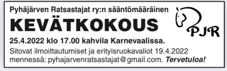 Tervetuloa Pyhäjärven Ratsastajat ry:n sääntömääräiseen kevätkokoukseen Kahvila Karnevaaliin 25.04.2022 klo 17 alkaen. Sitovat ilmoittautumiset ja erityisruokavaliot 19.4.2022 mennessä: pyhajarvenratsastajat@gmail.com. Tervetuloa! Kategoriat: Tiedote Tags: kokouspjr
