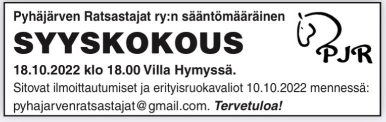 Tervetuloa Pyhäjärven Ratsastajat ry:n sääntömääräiseen syyskokoukseen Villa Hymyyn 18.10.2022 klo 18 alkaen. Sitovat ilmoittautumiset ja erityisruokavaliot 10.10.2022 mennessä: pyhajarvenratsastajat@gmail.com. Tervetuloa! Kategoriat: Tiedote Tags: kokouspjr